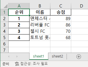 이런 경우에는 pandas의 ExcelWriter() 함수를 활용하면 됩니다. 바로 간단한 예제 코드로 어떻게 하면 되는지 살펴보시죠. 2022년 5월 15일 밤 11시 기준 프리미어리그 4위까지 랭킹과 라리가 4위까지의 랭킹을 각각 데이터프레임으로 만든 후에 엑셀 파일로 변환하는 코드입니다. 프리미어리그 순위는 sheet1에 저장되게 했고, 라리가 순위는 sheet2에 저장되게 했습니다.