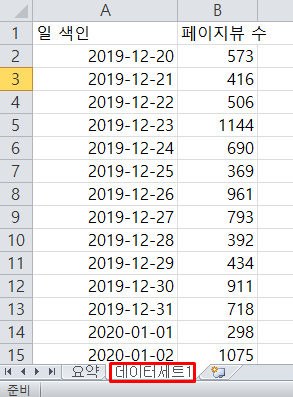 보시다시피 두번째 Sheet인 데이터세트1에 날짜와 그 날의 페이지뷰 수가 들어가 있습니다.
