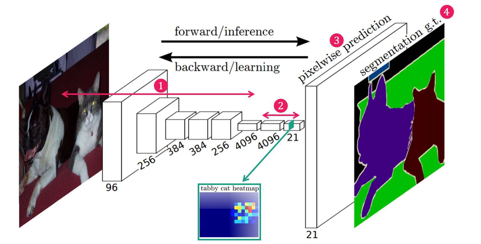 여기서 중요한 것은 이 컨볼루션층들을 거치고 나서 얻게 된 마지막 특성맵의 갯수는 훈련된 클래스의 갯수와 동일하다는 것이다. 21개의 클래스로 훈련된 네트워크라면 21개의 특성맵(이것을 heatmap이라고도 부른다)을 산출해낸다. 각 특성맵은 하나의 클래스를 대표한다. 만약 고양이 클래스에 대한 특성맵이라면 고양이가 있는 위치의 픽셀값들이 높고, 강아지 클래스에 대한 특성맵이라면 강아지 위치의 픽셀값들이 높다.