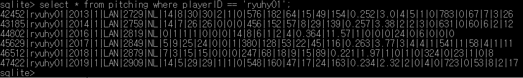 sqlite> select * from pitching where playerID == 'ryuhy01';