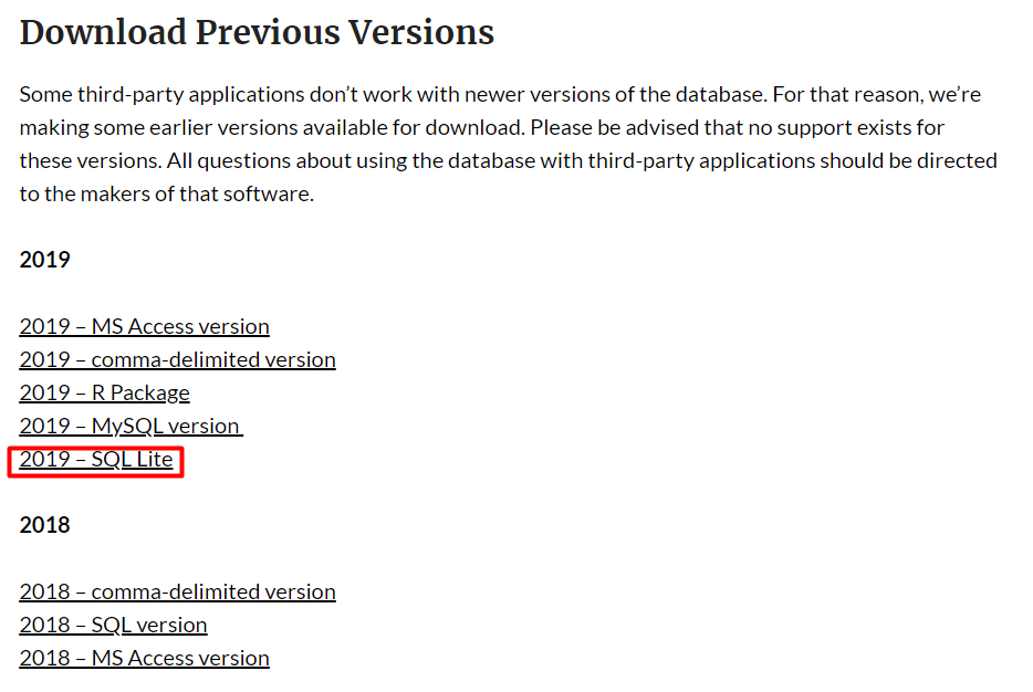 레먼 데이터베이스의 경우 매년 새롭게 갱신해서 데이터를 제공합니다. 그중에서 2019년까지의 기록을 담고 있는 데이터베이스의 경우 sqlite 형태로도 데이터를 제공하기에, 다운로드 받아서 실행해봤습니다.