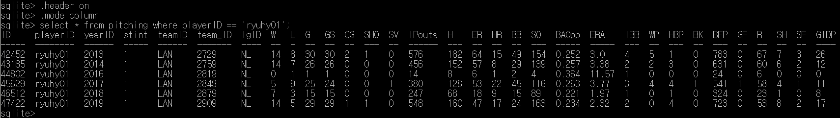 저는 투수 테이블에서 류현진 선수의 기록을 한 번 살펴보겠습니다. 참고로 류현진 선수의 ID는 ryuhy01입니다.