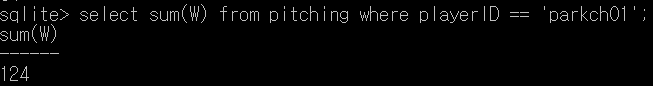 sqlite> select sum(W) from pitching where playerID == 'parkch01';