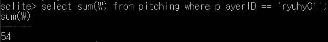 sqlite> select sum(W) from pitching where playerID == 'ryuhy01';