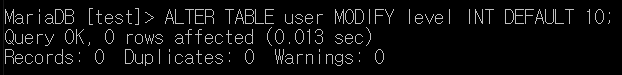 MariaDB [test]> ALTER TABLE user MODIFY level INT DEFAULT 10;