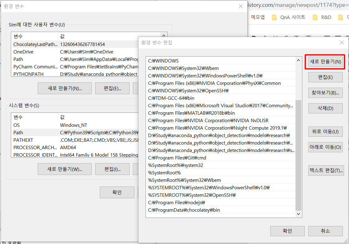 [환경 변수]를 클릭하면 다음과 같은 창이 뜹니다. 여기서 [시스템 변수] 부분에서 Path를 더블클릭합니다.
