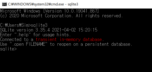이제 다 되었습니다. cmd를 열고, sqlite3를 명령해줍니다. 다음과 같은 화면이 뜨면 sqlite3를 사용할 준비가 된 것입니다.