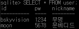 sqlite> INSERT INTO user (id, pw, nickname) VALUES ('moon', '5678', '문베디드');