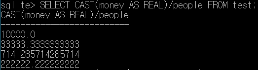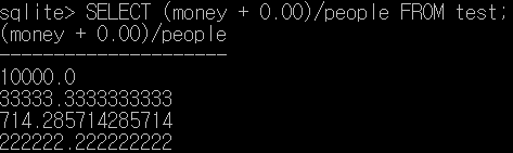 sqlite> SELECT (money + 0.00)/people FROM test;