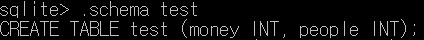 이 테이블의 구조를 살펴보면, money 열과 people 열 모두 INT 형의 데이터를 담을 수 있음을 알 수 있습니다. 참고로 sqlite에서 사용가능한 데이터타입에는 NULL, INT, REAL, TEXT, BLOB이 있는데, 이 중 INT와 REAL이 숫자 데이터를 위한 타입들입니다. INT는 정수, REAL은 실수.