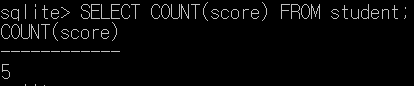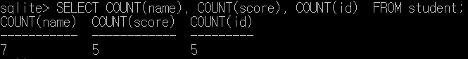 sqlite> SELECT COUNT(name), COUNT(score), COUNT(id) FROM student;