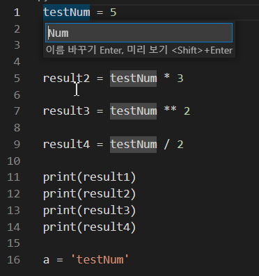 아래 코드에서 testNum은 총 5번 출현합니다. 만약 testNum을 num으로 바꿔주고 싶다면 그 행들을 찾아가서 각각 수정해줘야겠죠? 개수가 몇개 안되면 큰 문제가 없지만 약 10번 정도만 반복 출현해도 굉장히 고치기 짜증스러워집니다. 다행히도 vscode에서는 이러한 반복되는 변수명을 단번에 쉽게 수정할 수 있습니다.