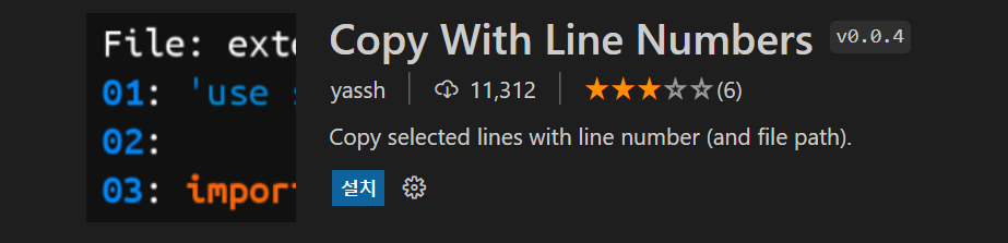 Ctrl + Shift + X로 확장 마켓플레이스를 연 후에 검색창에 copy with line numbers를 입력하셔서 찾으신 후에 설치합니다. 테스트를 위해 간단한 코드를 작성했습니다.
