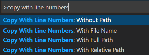 위 코드 전체를 선택한 후 F1 키를 누른 다음에 copy with line numbers를 입력합니다. 그러면 아래와 같이 4가지 중 하나를 선택할 수 있을 것입니다.