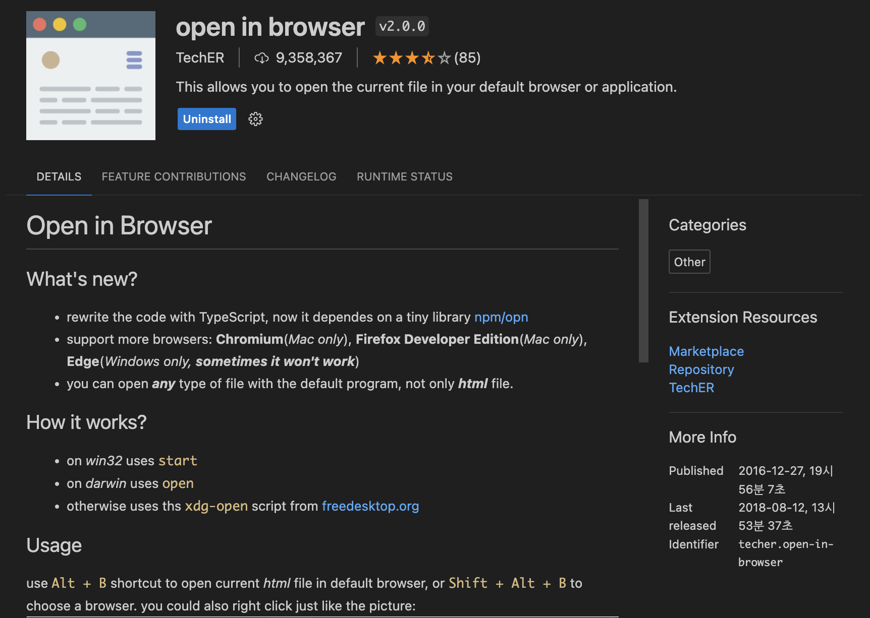 우선 마켓플레이스에서 open in browser를 검색한 후 TechER이 만든 것을 선택하여 설치합니다.