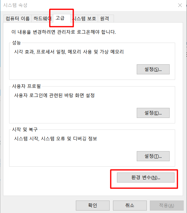 이제 환경 변수 버튼을 누르시고 경로 설정을 해주시면 됩니다.
